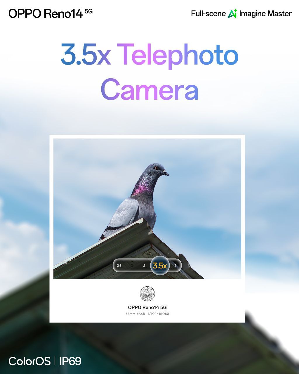 OPPO Reno14 Series 5G ရဲ့ ထုတ်ကုန်တွေထဲမှာမှ OPPO Reno14 Pro 5G နဲ့ OPPO Reno14 5G တို့မှာ ပါရှိတဲ့ 3.5x Telephoto Camera ဟာဆိုရင် အဝေးက အရာဝတ္ထုတွေနဲ့ ပုံရိပ်တွေကို အသေးစိတ် အချက်အလက်ကအစ ပေါ်လွင်အောင် အသေသပ်ဆုံးနဲ့ တိကျလှပစွာ ဖမ်းယူပေးနိုင်မဲ့အပြင် တိကျလှပတဲ့ Hardware Level အဆင့်ရှိ 3.5x Telephoto Camera ကို တပ်ဆင်ထားနိုင်တဲ့ နောက်ဆုံးပေါ် Flagship နည်းပညာကြောင့် သုံးစွဲသူတွေရဲ့ လိုအပ်ချက်ကို ပိုပြီး ပြည့်စုံစေနိုင်မှာဖြစ်ပါတယ်။
