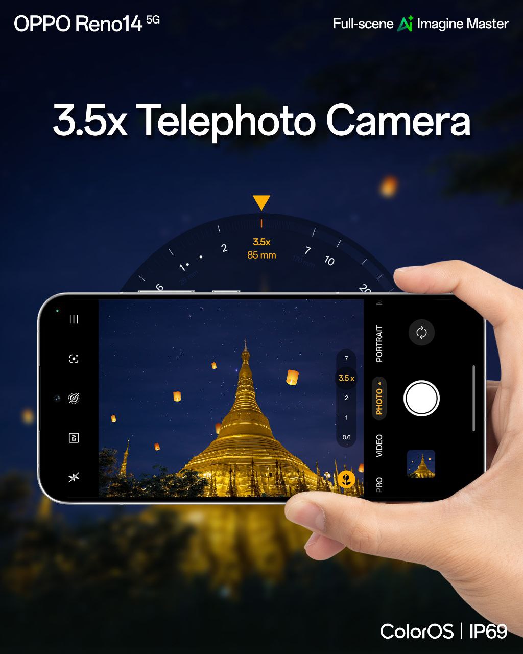 The post အဝေးက ပုံရိပ်တွေကို တိကျလှပစွာ ဖမ်းယူနိုင်အောင် Hardware Level အဆင့်ရှိ 3.5x Optical Zoom ပါရှိတဲ့ Telephoto Camera နဲ့အတူ OPPO Reno14 5G appeared first on YOYARLAY Digital Media and News.